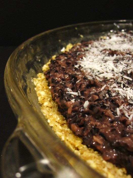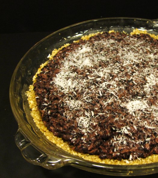 While the crust is cooling, start the water for the rice. When it boils, add rice, cover, and simmer for about 30 minutes, until all the water is absorbed. Add coconut milk, maple syrup, and coconut flakes, and continue to cook until the liquid is absorbed, about 20 minutes more. I stirred continuously (it makes for meditative thinking time, hehe), but I’m not entirely sure this is necessary—occasional stirring would likely be okay. Transfer the pudding to a bowl, and let cool. Chill briefly in the fridge before using. Once chilled, pour the pudding into the tart shell, and chill until serving. I topped mine with more shredded coconut.