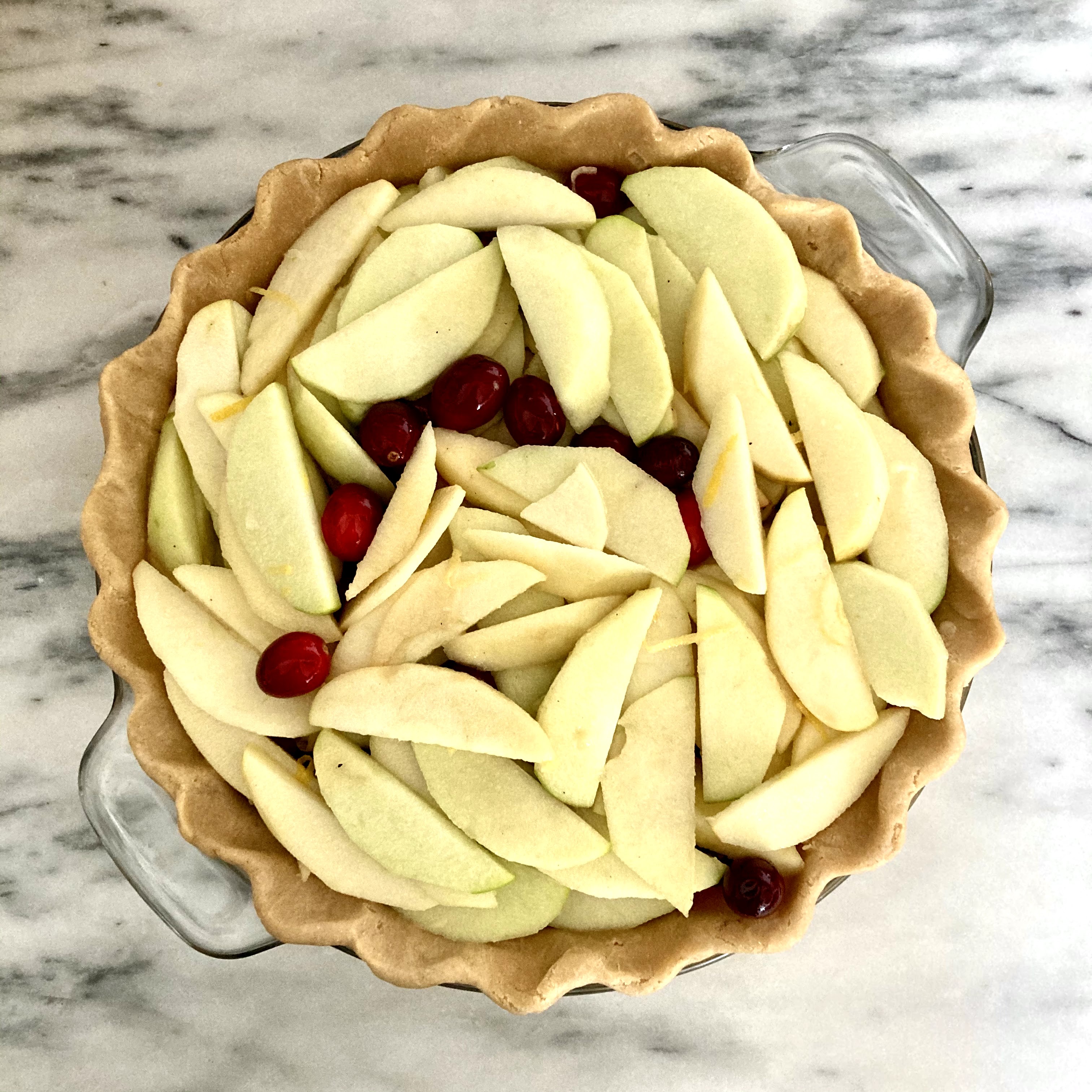 Peel the apple and shred on the large holes of a box grater. Drain the plumped dried cranberries of excess water, but do not press or squeeze them out. Add the shredded apple and the drained dried cranberries to the bowl with the rest of the filling and mix well. Stir in the vanilla extract and egg, and mix well. Pile in the fruit – typically you can fit much more than you think you can – you’ll want it to be slightly convex on the top, to account for the fruit decreasing in volume as it cooks. Lay on the top crust pieces, and put back in the fridge to chill while the oven preheats.